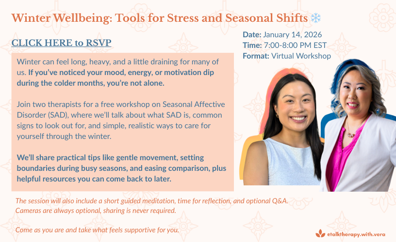 Winter can bring subtle (and not-so-subtle) shifts in mood, energy, and motivation. If the colder months have been feeling heavier or more draining, this free virtual workshop (Wednesday January 14th from 7:00 pm EST – 8:00 pm EST) offers gentle, practical support. Led by Vera & Taylor, the session explores Seasonal Affective Disorder (SAD), common signs to watch for, and realistic ways to care for yourself through winter. The focus is on simple tools, reflection, and meeting yourself where you are. Click the image below to RSVP.